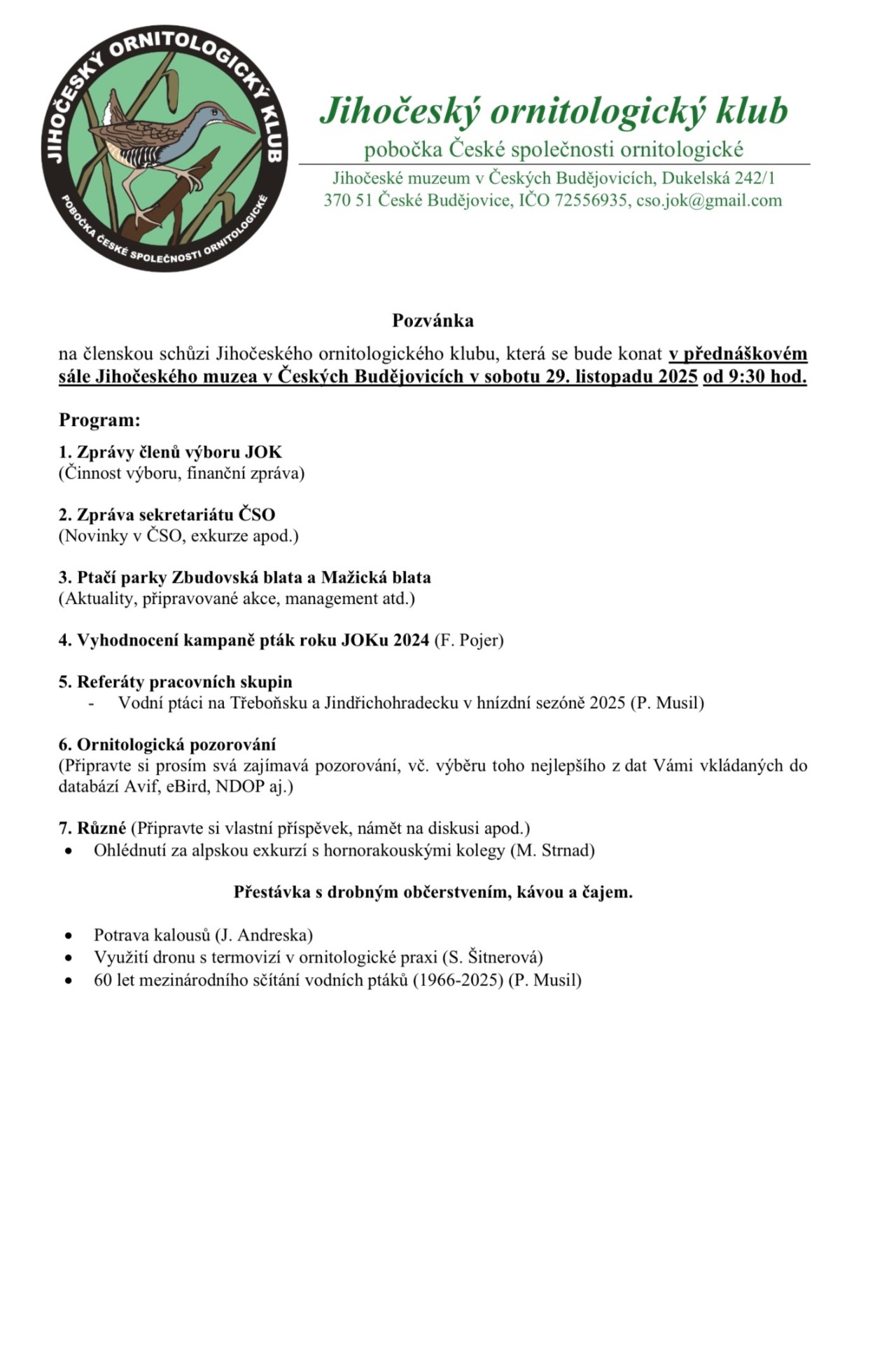 Členská schůze se uskuteční 29. listopadu 2025.
